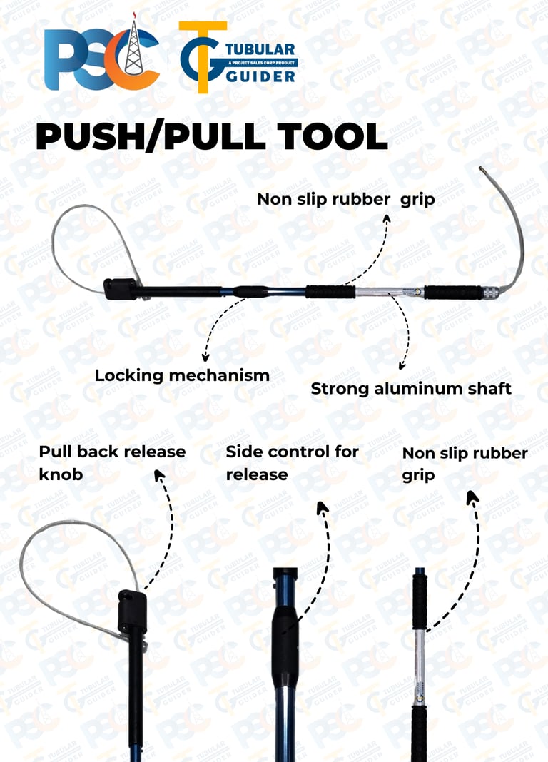 The PSC Tubular Guider is a specialized push-pull safety tool engineered for hands-free positioning of suspended tubular loads and pipes.